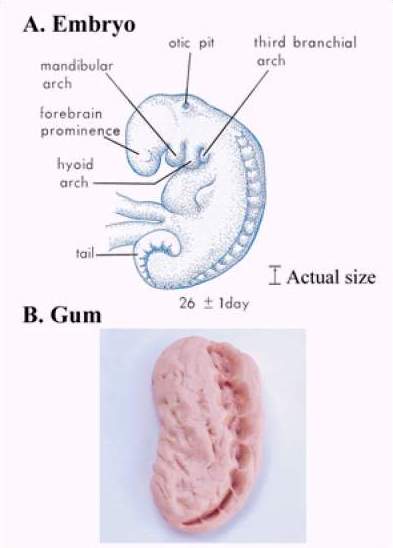 Figure 3. Top, a drawing of a 28 day-old human embryo showing several bead-like somites which resemble the teeth marks in the model shown to the left. |