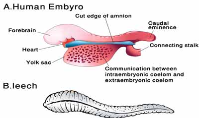 Figure 2. Top, a drawing of a 24 day-old human embryo. Note the leech-like appearance of the human embryo at this stage. Below, a drawing of a leech or bloodsucker. |
