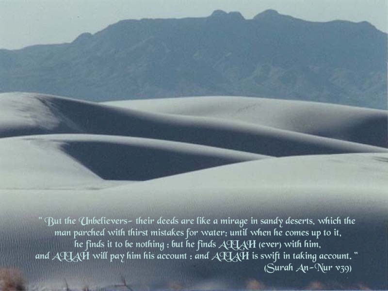 24;39. But the Unbelievers -- their deeds are like a mirage in sandy deserts, which the man parched with thirst mistakes for water;
