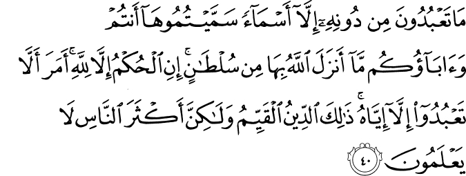 Transliteration Ma_ ta'budu_na min du_nihi illa_ asma_'an sammaitumu_ha_ antum wa a_ba_'ukum ma_ anzalalla_hu biha_ min sulta_n(in), inil hukmu illa_ lilla_h(i), amara alla_ ta'budu_ illa_ iyya_h(u), za_likad dinul qayyimu wa la_kinna aksaran na_si la_ ya'lamu_n(a).
